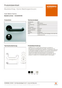 - NORMBAU Drücker und Abdeckungen der Rosetten und Schilder aus Nylon, optional mit antibakteriellem Schutz, Farbe…, Drücker Ø 23 mm, mit durchgehenden korrosionsgeschützten Stahlkernen, mit festdrehbarer Verbindung in wartungsfreien Gleitlagern, Stützzapfen Ø 7 mm, verdeckte, lockerungssichere Verschraubung mit beschichteten Hülsenschrauben M4. Die Garnituren entsprechen der DIN EN 1906, Gebrauchsklasse 3 und der DIN 18255. FS-Ausführung mit zusätzlicher Drückerstiftverbindung nach DIN 18273 / DIN 179. Lieferbar für Türstärke 35-94 mm. Bei Bestellung bitte Türstärke angeben.